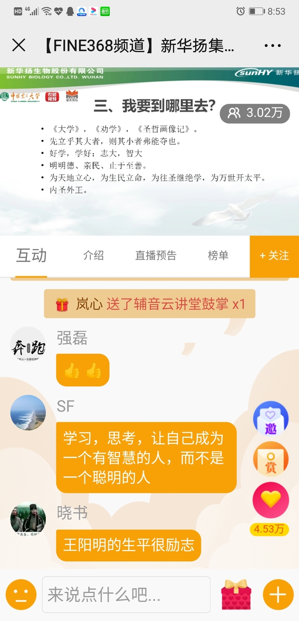 原来,当晚7:45分在“辅音云讲堂”直播平台上有来自于武汉新华扬生物股份有限公司副总裁金良元先生题为“好好学习天天向上”的一场直播。生物学院药品质管教研室主任组织全体老师和药管、药营两个专业18级、19级全体同学(约300人)参加了这次线上直播学习,探讨关于“学习”的主题。