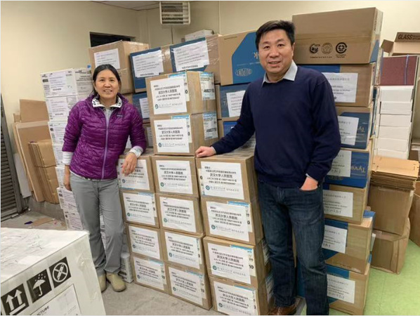图为:刘璋联系武昌实验中学北美校友会负责人捐赠的防护物资