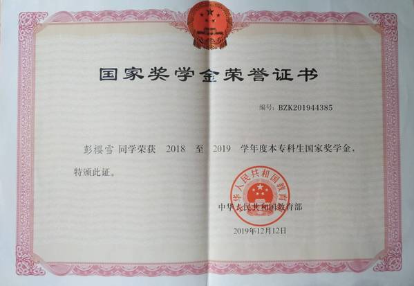 彭樱雪,食品17303班班长,始终以广大同学的共同利益为最基本的出发点,处处从同学们的需要出发,认真组织班内活动,配合辅导员和老师的工作,有良好的群众基础,并受到同学和老师的一致好评。在学习上,一直严格要求自己,勤奋踏实、积极主动,成绩优异,学习成绩始终排名班级前列,所有课程平均成绩达90分。曾获校优秀学生、笃学进步奖、国家励志奖学金、国家奖学金等多项荣誉。学习之余,踊跃参加课外活动,在2018年8月获得“挑战杯——彩虹人生”全国职业学校创新创效创业大赛(生产工艺革新与工作流程优化类竞赛)三等奖。在思想上,积极上进,不断地向党组织靠拢,2019年6月被推荐为中国共产党预备党员。彭樱雪在校期间始终保持着艰苦朴素的生活作风,从不与他人攀比,平时与同学相处融洽,乐于帮助同学,在学习和生活中建立了良好的人际关系,获得了大家的尊重和支持。2020年6月,获得学校“优秀毕业生”荣誉称号。彭樱雪说:“我来自于一个普通的家庭。进入大学校门那刻起,我就告诫自己哪怕现在的自己不会很优秀、很突出,但我一定要比别人更加努力,在三年的时间要凭借着自己的努力去奋斗,去改变自己、突破自己。”彭樱雪在专升本考试中,最终以优异成绩被江汉大学生物技术专业录取。