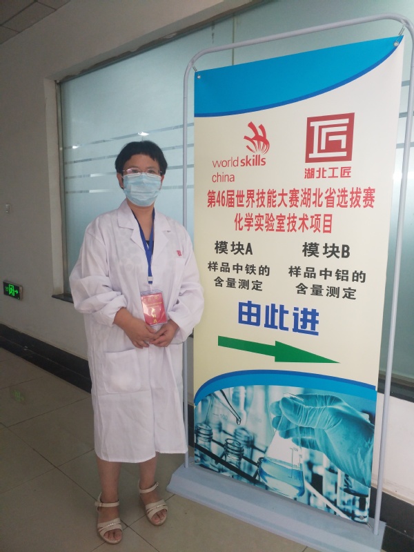 陈芬老师多次参与指导技能大赛与执裁工作,有丰富的执裁经验,此次受邀担任化学实验室操作技术裁判工作。“我校的专业设置侧重生物技术,这次没有组织学生参加化学实验室技能比赛,有些遗憾。但是能有幸作为裁判,参与此项盛事,与武汉大学、华中科技大学等名牌大学的老师、企业专家及世赛指导专家们进行交流和学习,了解世界技能大赛比赛项目设计对能力的要求,对我有很大的启发。本次选拔赛分为A、B、C三个模块,不设理论考试,全部通过完成任务来展示选手水平,考查学生灵活运用理念知识的能力、技能的熟练程度和以及创新能力,这对我们教学中的项目教学设计与评价做出了示范,为我们的教学改革提供了思路,希望能’以赛促建’,帮助我们更好地提高人才培养质量。“