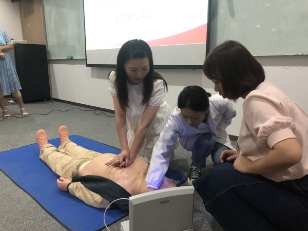 随后,陈洁通过重点动作讲解,教大家掌握了心肺复苏C-A-B的急救步骤和基本动作要领,了解了AED的使用方法和注意事项,并通过CPR模型给大家详细讲解和演示了CPR和AED的整体操作流程。