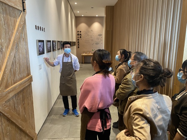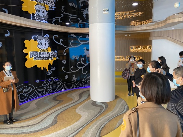 周黑鸭工作人员问参观学员讲解企业文化