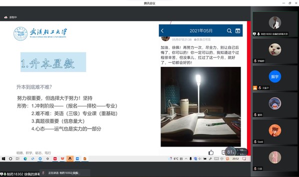 武职网讯(通讯员 王振宇)“想继续深造,但苦于理论知识薄弱”“想提高效率,但缺乏灵丹妙药”“想稳定心态,但困于现实压力”…眼看毕业季即将到来,2019级生物学院的部分学子们流露出对专升本考试的各种担忧。为帮助部分专升本学生排忧解难,3月20日晚8点,生物工程学院学生工作办公室依托腾讯会议,在线上举办了“专升本”复习考试的经验交流分享会。该院2019级毕业生100余人汇聚一堂,切磋学习方法,碰撞思维火花,在“云端”掀起了学习热浪。