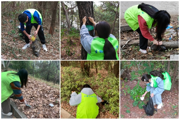 志愿者身穿绿马甲分成四个组,由学生预备党员陈俊和罗玉娴带队分头行动。一路上,志愿者们不停地捡拾丢弃在草丛、山路上的白色垃圾等杂物,穿梭在林间,不放过每一个角落。