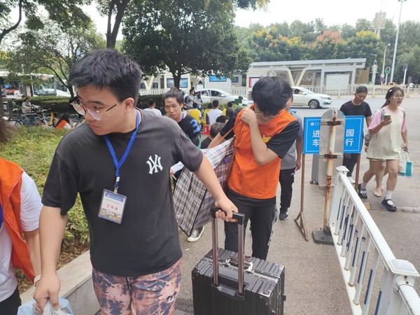 两人一边说,一边争抢着协助新生搬运行李。这样互帮互助、一马当先、吃苦耐劳的志愿者们在迎新现场随处可见。“咔嚓”一声,“相机学长”将画面封存。