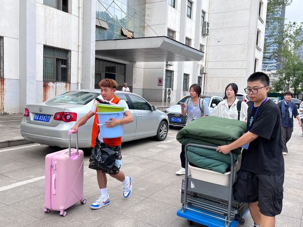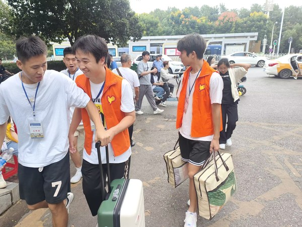 新生李全露(左一)协助新生搬行李