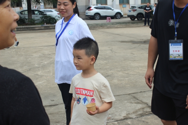 “小朋友,你来干嘛的呀?”药管22301班刘世立笑眯眯地蹲下,向身旁一位萌萌的小男孩递上精致的小糕点。小男孩开心地说:“我送舅舅来上学,舅舅的学校好大好漂亮啊!”