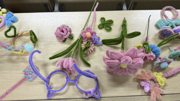 6月4日,德馨楼201教室内一片欢声笑语,一场别开生面的手工制作“扭扭棒”教学活动正在精彩上演。20名同学围坐在一起,认真听志愿者讲解,讨论创作思路,并动手制作“扭扭棒”。看着一个个造型奇特的作品,教室内充满了欢乐氛围。