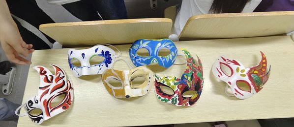 “你的颜色好好看!”“你的搭配很新颖啊。”大家你一言我一语,开心地展示着各自的作品,在欢声笑语中增进感情,并通过颜色的搭配揭开面具下真实自己,对自我有了更进一步的认识。淡淡的颜料气息弥漫在教室上空,伴随着欢笑声和交谈声,现场呈现出一片轻松愉悦氛围。